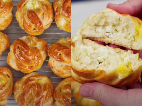Κόβουμε σε τετράγωνο σχήμα όπως θα δείτε και στο βίντεο με την εκτέλεση παρακάτω. Απλώνουμε θρυμματισμένη φέτα στην πλευρά και δίνουμε το σχήμα. Τοποθετούμε τα τυροπιτάκια μας σε ένα ταψί με λαδόκολλα και τα αλείφουμε με τον χτυπημένο κρόκο αυγού. Τα ψήνουμε στους 180 βαθμούς Κελσίου, στις αντιστάσεις, μέχρι να ροδίσουν.
