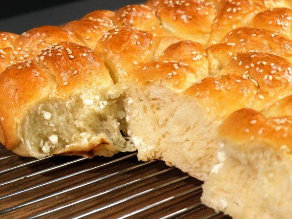670 g einfaches Mehl 130 g Wasser 140 g Milch 9 g Trockenhefe 2 EL Joghurt 50 g Pflanzenöl 1 mittelgroßes Ei 1 TL Salz 1 EL Zucker 1 EL Butter ——————————— 380 g griechischer Feta-Käse Butter ——————————— Sesam 1 mittelgroßes Ei 1 EL Milch
