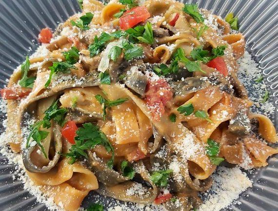 Ταλιατελες λαχανικών με κρεμώδη σάλτσα από μανιτάρια ντοματίνια και κρεμά γάλακτος. Ως φανατική των ζυμαρικών αυτή την συνταγή την λάτρεψα, είναι εύκολη πεντανόστιμη και γεμάτη χρώματά. Σε αυτό το πιάτο οι ταλιατέλες μπλέκονται τέλεια με τα μανιτάρια, την πιπεριά Φλωρίνης και τα υπόλοιπα υλικά μέσα σε μια πλούσια σάλτσα, ντομάτας και κρεμάς γάλατος.