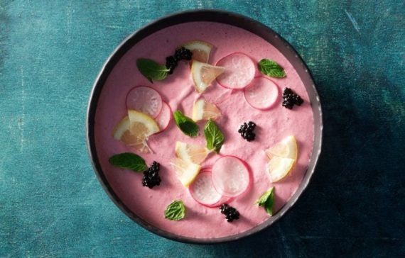Υλικά 300 γρ. «χωριάτικο» ψωμί (ιδανικά 2 ημερών, για να έχει «σώμα» η ταραμοσαλάτα που θα φτιάξουμε) 150 γρ. λευκό ταραμά 1 μικρό ξερό κρεμμύδι (70 γρ.), χοντροκομμένο 200 ml ελαιόλαδο 70-100 ml χυμό λάιμ 100 γρ. παντζάρια, βρασμένα ή ψημένα και ψιλοκομμένα, εναλλάξ με το ψωμί 1 κουτ. γλυκού βαλσαμικό ξίδι Για το σερβίρισμα