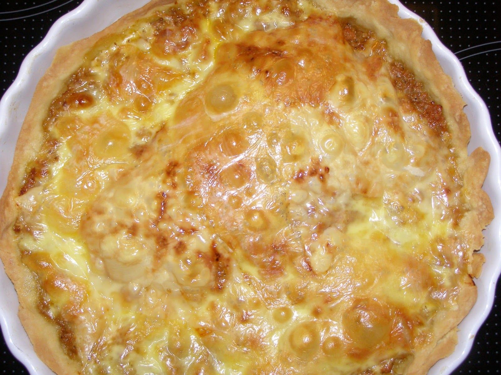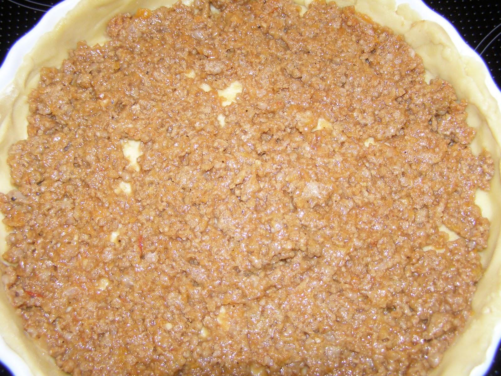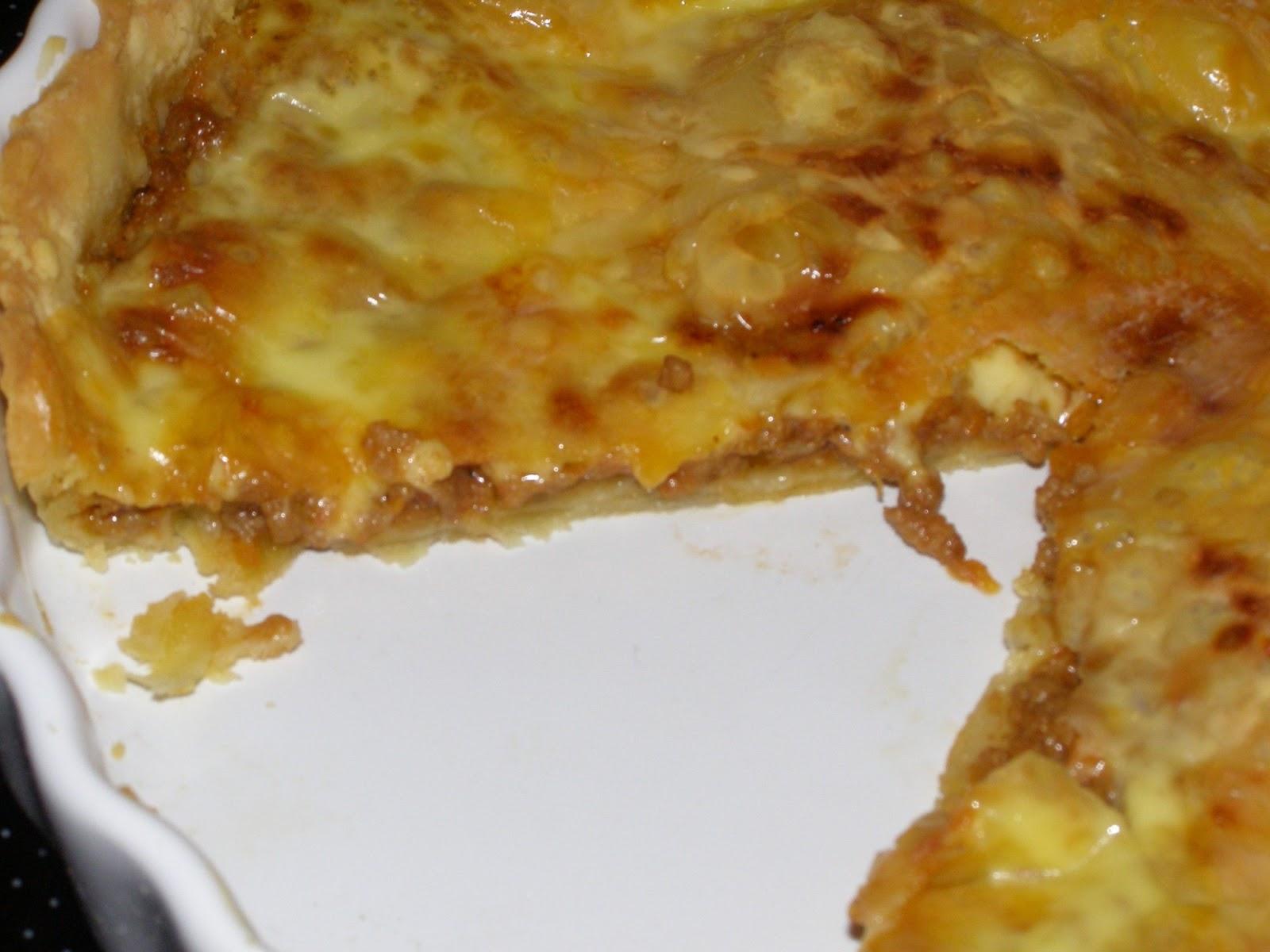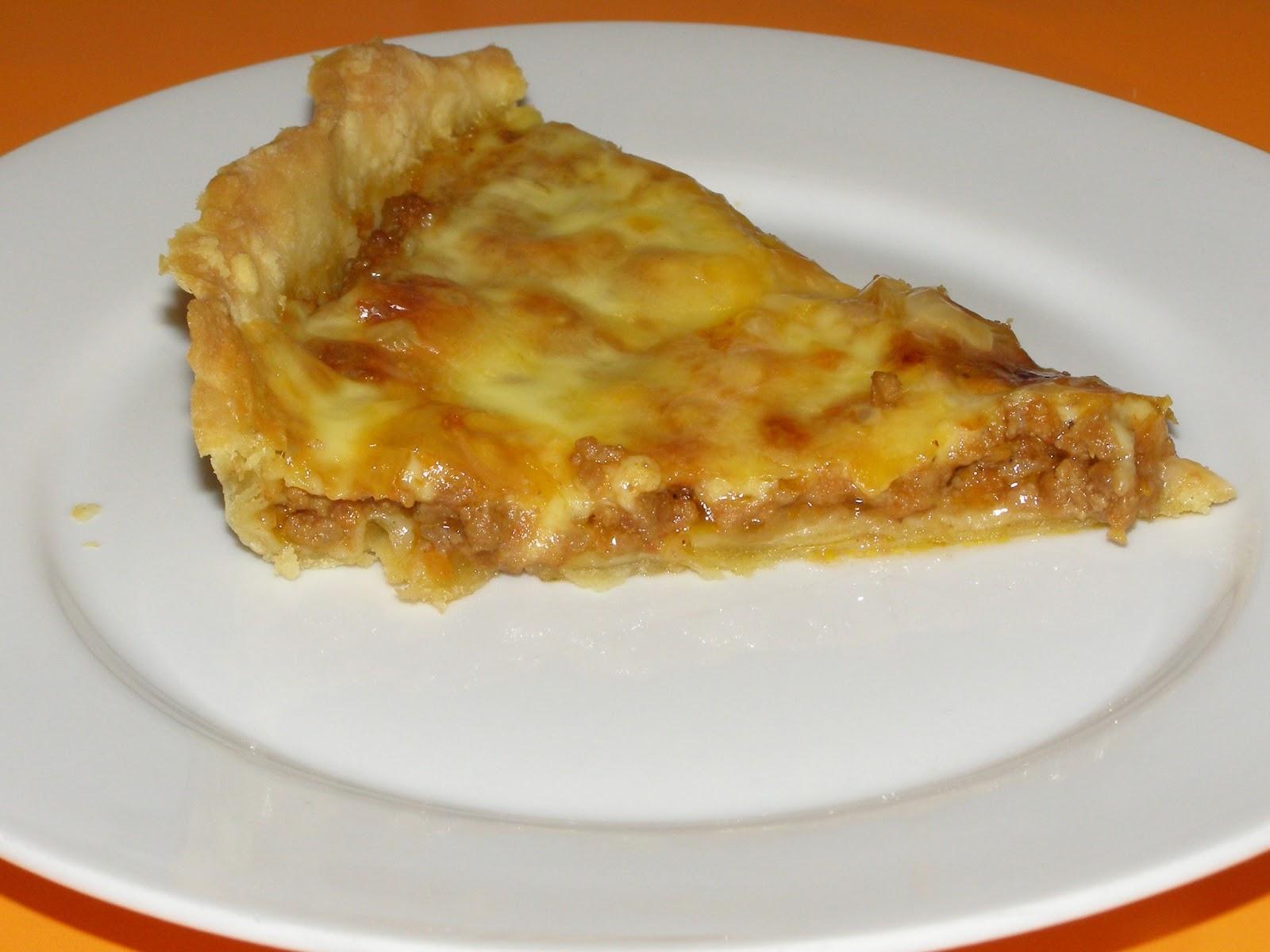 Κόβουμε το βούτυρο σε κομματάκια και το ρίχνουμε στο αλεύρι στο οποίο έχουμε ρίξει και το αλάτι. Θρυμματίζουμε το βούτυρο με τα δάχτυλα ώστε να γίνει το μείγμα ψιχουλιαστό. Ρίχνουμε και το αυγό ενσωματώνοντάς το στο μείγμα. Ζυμώνουμε για λίγο και με γρήγορες κινήσεις κάνοντάς το ζυμάρι μια μπάλα. Τυλίγουμε σε μεμβράνη και αφήνουμε στο ψυγείο για τουλάχιστον 20 λεπτά. Η ποσότητα ζύμης αρκεί για δύο τάρτες. Αν χρησιμοποιήσουμε τη μισή, μπορούμε να τυλίξουμε την υπόλοιπη σε μεμβράνη και να τη φυλάξουμε στην κατάψυξη. Ανοίγουμε τη ζύμη σε λεπτό φύλλο και ντύνουμε μια βουτυρωμένη ταρτιέρα. Τρυπάμε το φύλλο με ένα πιρούνι σε ορισμένα σημεία. Στρώνουμε πάνω στο φύλλο ένα λαδόχαρτο και σκορπίζουμε πάνω του φασόλια. Ψήνουμε το φύλλο σε προθερμασμένο φούρνο στους 180βαθμούς για 20 λεπτά. Απλώνουμε πάνω στην τάρτα τον κιμά και από πάνω τις φέτες του τυριού. Ψήνουμε για άλλα 7-8λεπτά.