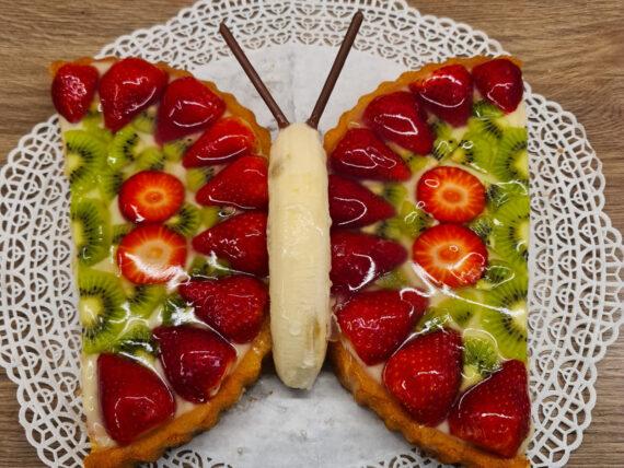 Μόλις η κρέμα κρυώσει πολύ καλά κόβουμε στη μέση την τάρτα για να σχηματιστεί η πεταλούδα. Απλώνουμε την κρέμα και προσθέτουμε τις φράουλες και τα ακτινίδια. Στη μέση βάζουμε μία ξεφλουδισμένη μπανάνα για το σώμα της πεταλούδας.