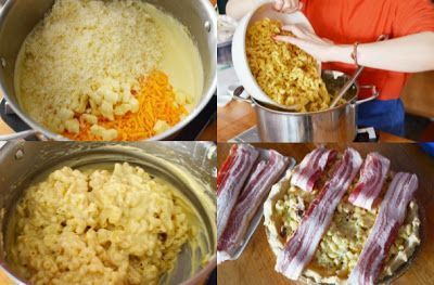 Προσθέστε τα μακαρόνια και τα κομμάτια μπέικον στην σάλτσα τυριού. Προθερμαίνετε το φούρνο στους 210 C.