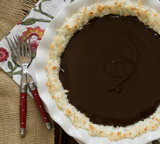 Προθερμαίνετε το φούρνο στους 180 βαθμούς και βουτυρώνετε μια ταρτιέρα, διαστάσεων βάσης 23 εκ. Για τη βάση: Ρίχνετε σε μπλέντερ ή μούλτι, το μισό ινδοκάρυδο με το βούτυρο και τα χτυπάτε για 1-2 λ μέχρι να έχετε μια μάζα μείγματος.Το μεταφέρετε σε μπολ, προσθέτετε και το υπόλοιπο ινδοκάρυδο και ανακατεύετε καλά. Ρίχνετε στο μείγμα στο κέντρο της ταρτιέρας και το στρώνετε ισομερώς πιέζοντάς το ελαφρώς μόνο στη βάση ενώ στα τοιχώματα το στρώνετε λιγότερο συμπιεσμένο ώστε να είναι αφράτο. Το σκεπάζετε με αλουμινόχαρτο και το ψήνετε στο προθερμασμένο φούρνο για 13-15 λ περίπου. Αφαιρείτε το αλουμινόχαρτο και συνεχίζετε το ψήσιμο για 4-5 λ περίπου μέχρι να ροδίσουν οι άκρες. Το βγάζετε από το φούρνο και το αφήνετε στην άκρη να κρυώσει. Για τη γκανάς σοκολάτας: Λιώνετε σε μπεν μαρί τα κομματάκια σοκολάτας με τη κρέμα γάλακτος ανακατεύοντας μέχρι να έχετε μια λεία σοκολατένια κρέμα. Στρώνετε τη κρέμα πάνω στη κρύα πλέον βάση ινδοκάρυδου και τη βάζετε στο ψυγείο για 1-2 ώρες μέχρι να κρυώσει πλήρως. Τη κόβετε σε κομμάτια και σερβίρετε.