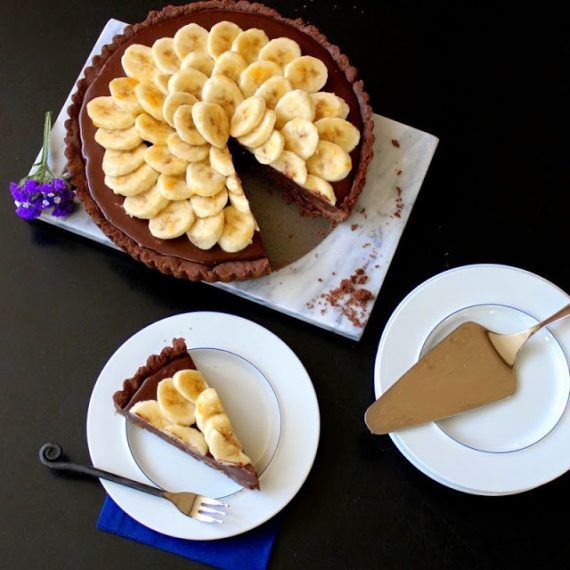Βγάζουμε την τάρτα απο την κατάψυξη, αφού έχει σφίξει η κρέμα, και περιχύνουμε με τη σάλτσα μπανάνας που φτιάξαμε.