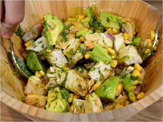 Put the chicken, avocado, onion, corn and dill in a bowl. In a jar, mix the extra virgin olive oil, vinegar, lemon juice, honey, mustard, salt and pepper. Pour the dressing over the salad and mix.