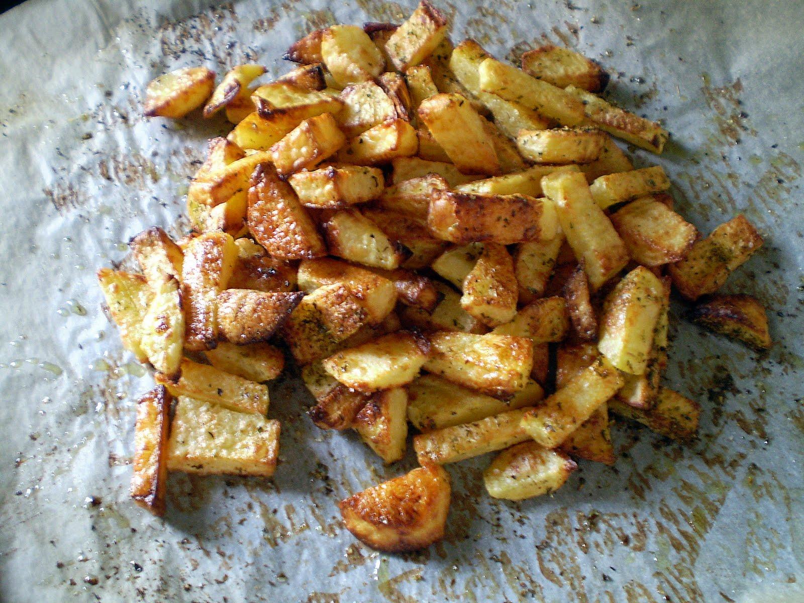 Ε Κ Τ Ε Λ Ε Σ Η Ζεσταίνω το λάδι σε αντικολλητικό τηγάνι και ρίχνω τα κομμάτια του σκόρδου. Τα σωτάρω για μερικά λεπτά και τα βγάζω. Ρίχνω το κρεμμύδι και σε λίγο τα κομμάτια του κοτόπουλου. Σωτάρω από όλες τις πλευρές, ρίχνω τις πιπεριές και το κρασί. Σε μερικά λεπτά εξατμίζεται το οινόπνευμα και ρίχνω την ντομάτα και το νερό. Χαμηλώνω την φωτιά, σκεπάζω και σιγοβράζω για 15′. Ξεσκεπάζω για πήξει η σάλτσα. Έτοιμο!! Τις πατάτες τις κόβω μικρά κομμάτια και τις λαδώνω με το χέρι, με μια-δυο κουταλιές ελαιόλαδο. Στρώνω λαδόκολλα σε ταψί, τις απλώνω και ψήνω στον προθερμασμένο φούρνο, μέχρι να ροδίσουν. Πασπαλίζω με χοντρό αλάτι και ρίγανη.
