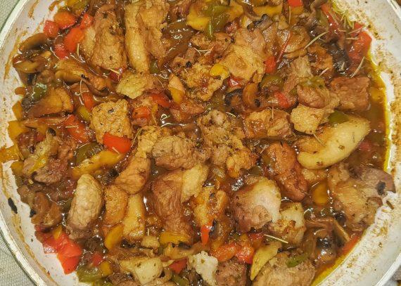 Αφού τα προσθέσουμε, βάζουμε το καπάκι στο τηγάνι και ψήνουμε το φαγητό μας σε σιγανή φωτιά για 30 λεπτά. Βγάζουμε το καπάκι από το τηγάνι και ψήνουμε το φαγητό για ακόμη 10-15 λεπτά σε δυνατή φωτιά έτσι ώστε να εξατμιστούν τα περισσότερα υγρά.