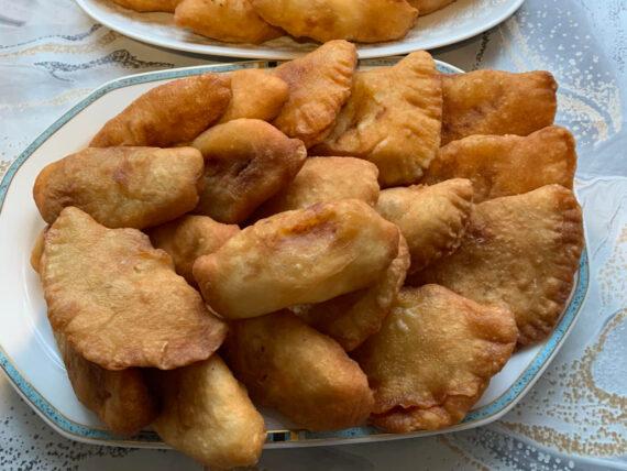 Ανοίγουμε το κάθε κομμάτι ζύμης σε φυλλαράκι με τον πλάστη και γεμίζουμε το κάθε φυλλαράκι με λίγη από την γέμιση. Κλείνουμε και τηγανίζουμε σε καυτό και μπόλικο ηλιέλαιο, σε χαμηλή φωτιά, μέχρι να πάρουν χρώμα.