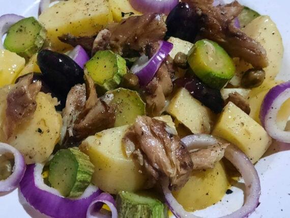 H αυθεντική παραδοσιακή συνταγή για Τηνιακή ρεγκοσαλάτα με πατάτες, κολοκυθάκια και μυρωδικά. Μια ζεστή πατατοσαλάτα για να συνοδεύσουμε τα όσπρια ή και τα ψάρια μας.