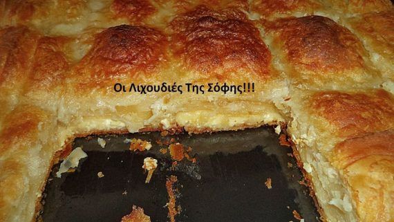 Τυρόπιτα με πανεύκολο χειροποίητο φύλλο σφολιάτας και γέμιση από σιμιγδαλόκρεμα με τυρί!!! ΥΛΙΚΑ ΓΙΑ ΤΟ ΦΥΛΛΟ 1 κιλό αλεύρι γ.ο.χ 500 ml νερό 1 κ.γ αλάτι 2 κ.σ ξύδι 4 κ.σ ελαιόλαδο ΥΛΙΚΑ ΓΙΑ ΤΗ ΓΕΜΙΣΗ 500-700 γρ.τυρί φέτα χοντροτριμμενη 1 λίτρο γάλα 1 φλ.τσαγιού (150 γρ.)σιμιγδάλι ψιλό 150 γρ.μαργαρίνη η φυτίνη πιπέρι 1 αυγό 1 κουτάκι (330 ml) σόδα αναψυκτικό 300 γρ.φυτίνη για το άλειμμα των φύλλων ΕΚΤΕΛΕΣΗ Στον κάδο του μίξερ ρίχνω όλα τα υλικά για το ζυμαράκι μου ή αλλιώς το ζυμώνω στο χέρι μέχρι να εχω μια ζύμη ελαστική και ευπλαστη που να μην κολλάει.Το σκεπάζω με μεμβράνη και το αφηνω να ξεκουραστεί λιγάκι. Σε μια κατσαρόλα ρίχνω τη φυτίνη και το σιμιγδάλι και το καβουρντίζω 1-2 λεπτά.Προσθέτω το γάλα και δένω σε κρέμα.Ρίχνω τη φέτα και μετά το αυγό.Προσθέτω πιπέρι και ρίχνω αλάτι μόνο αν το τυρί δεν είναι αλμυρό.Την αφήνω στην άκρη. Χωρίζω το ζυμάρι μου σε 16 μπαλάκια.Το κάθε μπαλάκι το ανόιγω σε δισκάκι με τον πλάστη διάμετρο περίπου 20 εκ.Φτιάχνω 2 ντάνες από 8 μπαλάκια την κάθε μία βάζοντας ανάμεσα μπόλικη φυτίνη.Στο τελευταίο δισκακι πάνω πάνω δεν βάζω φυτίνη αλλα πασπαλίζω με αλεύρι.Τοποθετώ τις 2 ντάνες από ζυμαρένια δισκάκια σε αλευρωμένα πιάτα,τυλίγω με μεμβράνη και βάζω στην κατάψυξη για 1 ωρα.να παγώσει το φυτικό λίπος. Βουτυρώνω το μεγάλο ταψί της κουζίνας και σε αλευρωμένη επιφάνεια ανόιγω τη μία ντανα από ζυμαρενια δισκάκι σε ένα μεγάλο φύλλο να εξέχει απο το ταψί μου.Αδειάζω μέσα τη γέμιση και σκεπάζω με το άλλο φύλλο που θα ανοίξω.Γυρίζω το φύλλο που εξέχει σε κόθρο και χαράζω τη πίτα μου σε κομμάτια. Περιχύνω με τη σόδα και ψήνω τη πίτα στους 180 για 1 ώρα και 10 λεπτά περίπου.Πρέπει να ψηθεί καλά καλα μέχρι μέσα να ροδοκοκκινήσει το φύλλο αλλα οχι σε πολύ δυνατό φουρνο. Είναι απλά συγκλονιστίκή!!!
