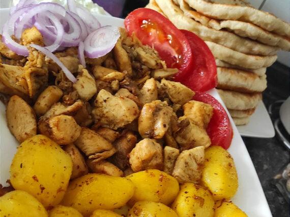 Δείτε παρακάτω την εκτέλεση για την τηγανιά κοτόπουλου με πατάτες και χειροποίητες πίτες: