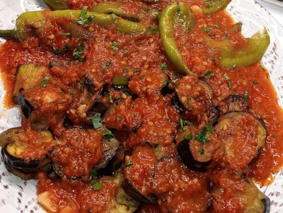 Αφού δέσει η σάλτσα, προσθέτουμε τις μελιτζάνες και τις πιπεριές, παίρνουν μία βράση όλα μαζί και σερβίρουμε προαιρετικά με φρέσκο ψιλοκομμένο μαϊντανό, φέτα και ψωμί.