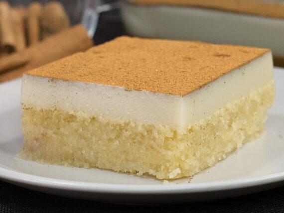 500 g water 500 g sugar 1 cinnamon stick ————————————– 500 g semolina ,coarse 200 g sugar 1/2 tsp mastic 1 tsp baking powder 450 g almond milk —————————————- 1200 g almond milk 120 g cornstarch 250 g sugar 2 vanilla —————————————– Cinnamon powder —————————————— 40×27 cm