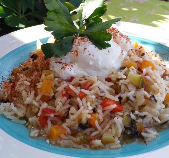 Βράζουμε για 3 λεπτά ακριβώς και τραβάμε από την φωτιά το φαγητό μας. Σκεπάζουμε το φαγητό μας με μία καθαρή πετσέτα και από πάνω με το καπάκι της κατσαρόλας. Το αφήνουμε να τραβήξει το ρύζι τα υγρά του και να μείνει σχεδόν μόνο με το λάδι του. Σερβίρουμε το ζεστό φαγητό μας με γιαούρτι και γλυκιά πάπρικα.
