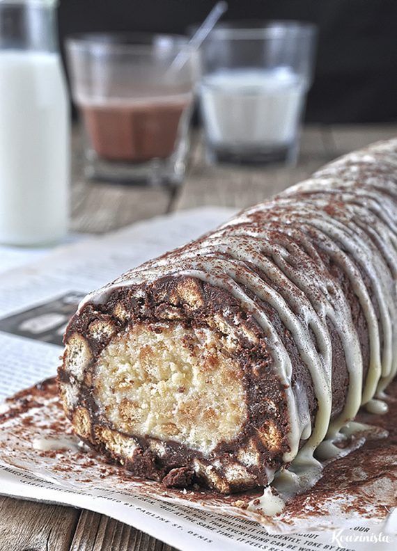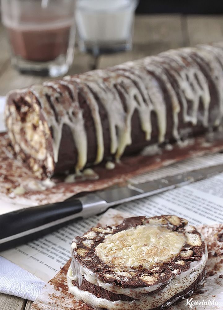 - Μετά που θα σφίξει, τοποθετούμε το μείγμα ανάμεσα σε δυο κομμάτια λαδόκολλας. Με τη βοήθεια του πλάστη, πιέζοντας και ρολάροντας, του δίνουμε ορθογώνιο σχήμα, με διαστάσεις 20x30cm. (Δεν το βάζουμε ξανά στο ψυγείο, για να μπορεί να τυλιχτεί χωρίς να σπάσει). Αφαιρούμε την πάνω λαδόκολλα, ξετυλίγουμε και τοποθετούμε στο κέντρο το παγωμένο ρολό της λευκής σοκολάτας. Σηκώνοντας τα δυο άκρα μαζί με τη λαδόκολλα, τα φέρνουμε πάνω από τη λευκή γέμιση και πιέζουμε να ενωθούν, κλείνοντας στο κέντρο τη γέμιση, ώστε να σχηματιστεί ένα μεγαλύτερο ρολό. Τυλίγουμε τον κορμό με λαδόκολλα και ρολάρουμε με μικρές κινήσεις μπρος πίσω για να πάρει καλύτερο σχήμα και να σφίξει. Τον βάζουμε στο ψυγείο, μέχρι να παγώσει καλά, ιδανικά όλο το βράδυ.