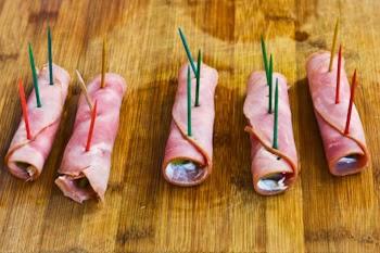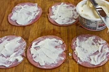 Αλείψτε κάθε φέτα ζαμπόν ή γαλοπούλας με 1 κ.γ κρέμα τυριού.