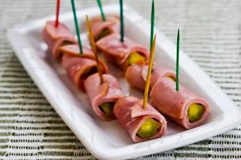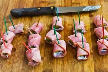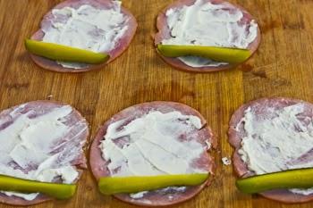Βάλτε ένα αγγουράκι τουρσί σε κάθε φέτα ζαμπόν.