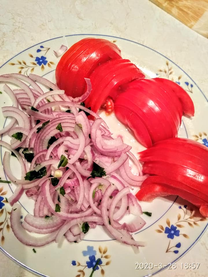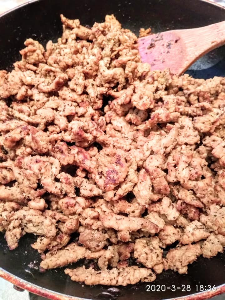 Έκανα ρολάκι το σνίτσελ και το έκοψα με ψαλίδι σε λεπτές λωρίδες. Το μαρινάρισα με αλάτι, πιπέρι, ρίγανη, κόλιανδρο, κόκκινο πιπέρι, κουρκουμά, 2-3 κουταλιές λάδι και το έψησα στο τηγάνι σε δυνατή φωτιά μέχρι να ροδίσει.