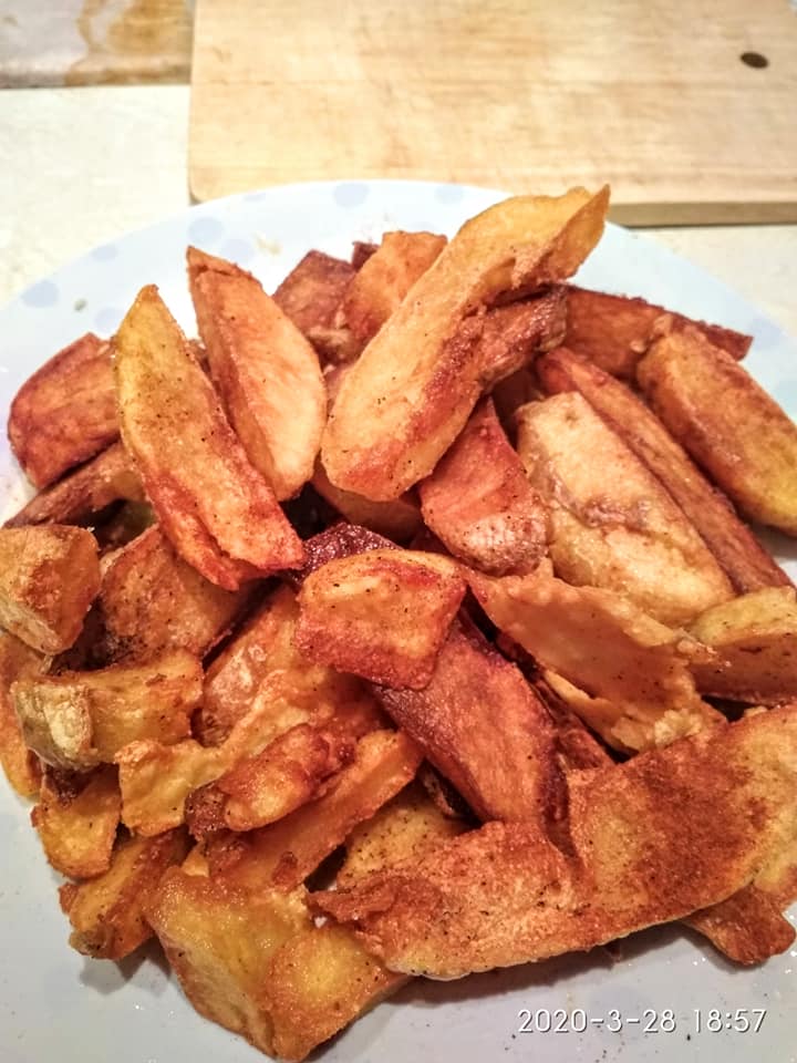 Έπλυνα ολόκληρες τις πατάτες με την φλούδα ή αν δεν σας αρέσουν μπορείτε και να τις καθαρίσετε. Τις έβαλα σε ένα ταψάκι που στον πάτο του έβαλα αλάτι μέχρι να καλυφθεί. Έψησα στο φούρνο στους 180 βαθμούς για 45 λεπτά αν είναι μικρές οι πατάτες αλλιώς αν είναι μεγαλύτερες 1 ώρα. Μόλις βγουν τις αφήνουμε να κρυώσουν (ή τις ετοιμάζουμε από την προηγούμενη) και μετά τις κόβουμε κυδωνάτες κ τις τηγανίζουμε. Μόλις τηγανιστούν πασπαλίζουμε με αλάτι, πιπέρι και πάπρικα.