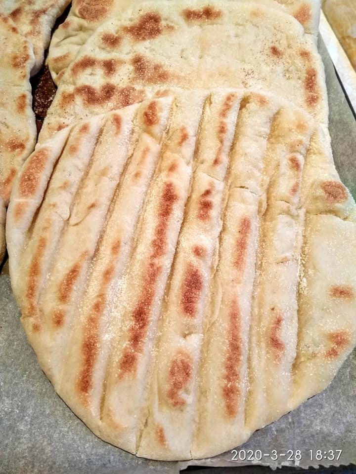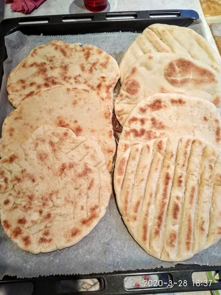 Μέτα περνώ το κάθε ένα και το ανοίγω σε πιτούλα, πασπαλίζοντας πάνω κάτω με σιμιγδάλι ψιλό. Βάζω τις πίτες μία μία σε τηγάνι χωρίς λάδι και τις ψήνω σε μέτρια θερμοκρασία και τις πατάω με μια σπάτουλα για να μην φουσκώσουν.