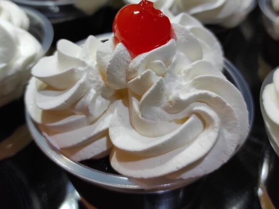 Τέλος χτυπάμε παγωμένη την φυτική σαντιγί στο μίξερ μέχρι να αφρατέψει καλά. Παίρνουμε 13 μικρά ποτηράκια και βάζουμε σε κάθε ποτηράκι μία δόση κρέμας μιλφέιγ.