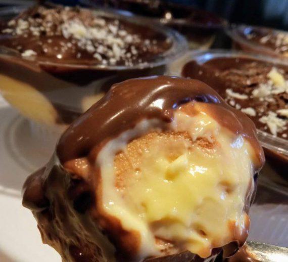 Γεμίζουμε ένα κορνέ με την κρέμα. Με το κορνέ γεμίζουμε τα σου με την κρέμα. Παίρνουμε φορμάκια ή ποτήρια και βάζουμε στον πάτο τους μία δόση κρέμας. Βάζουμε πάνω από την κρέμα 2-3 σου. Από πάνω βάζουμε λίγη ακόμη λευκή κρέμα και τελειώνουμε με την σοκολατένια κρέμα.