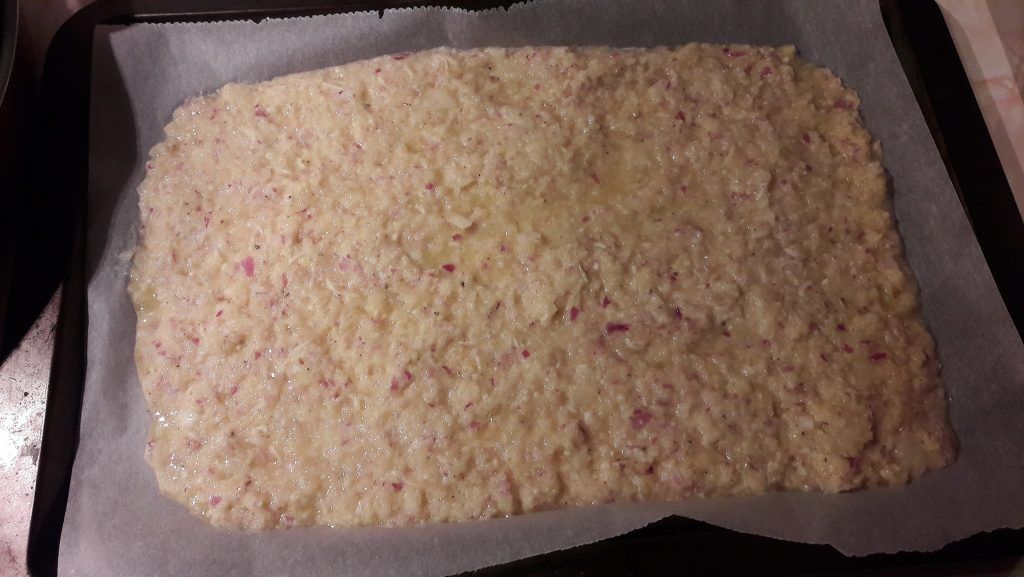ΥΛΙΚΑ: • 500 γρ. ωμές πατάτες καθαρισμένες και τριμμένες στο τρίφτη • 1 μικρό κόκκινο ξερό κρεμμυδι στο τρίφτη • 40γρ κεφαλοτύρι τριμμένο • 2 αυγά • πιπερι, ρίγανη και λίγο αλάτι