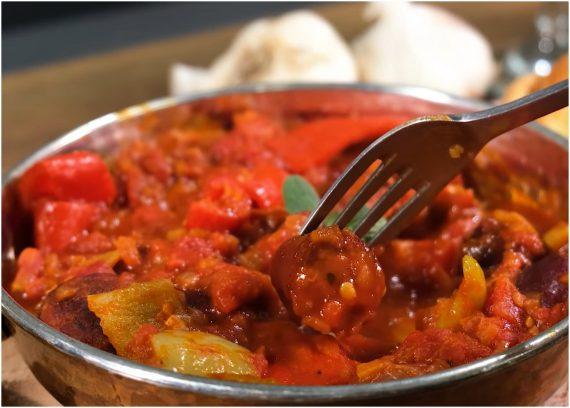 500 g beef smoked sausages 1 medium onion 2 red peppers 1 green pepper 1 green chili pepper 100 g cherry tomatoes 1 garlic clove 40 g olive oil 70 g white wine 1 tsp tomato paste 400 g canned tomatoes 150 g water Fleur de sel Oregano ————————————– 4-5 slices bread Olive oil Oregano