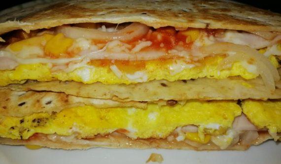 Στην αρχή κάνουμε μία ομελέτα με δύο αυγά σε αντικολλητικό τηγάνι. Αφού η ομελέτα μας γίνει την βάζουμε πάνω σε μία τορτίγια και μεταφέρουμε το φαγητό μας και πάλι στο τηγάνι. Βάζουμε πάνω την γαλοπούλα, το κεφαλοτύρι, το καλαμπόκι, το κρεμμύδι σε φέτες και την κέτσαπ.