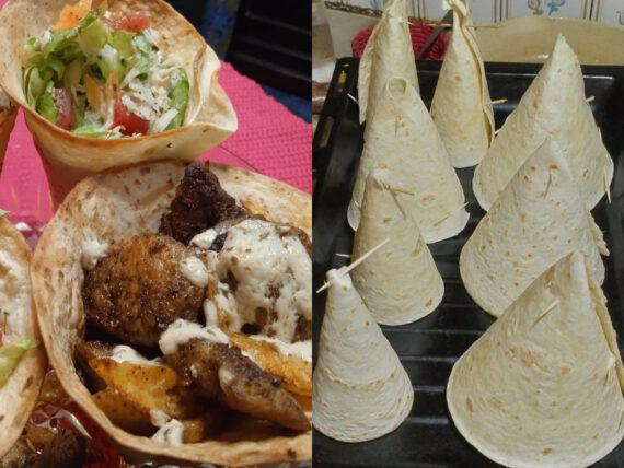Οι τορτίγιες είναι υπέροχες πίτες που μπορούν να μετατραπούν σε νόστιμα σάντουιτς. Σήμερα λοιπόν θα τις απολαύσουμε σε χωνάκια, ψημένες στο φούρνο. Τις μισές τις γεμίσαμε με μπουκιές κοτόπουλου και τηγανιτές πατάτες και τις άλλες μισές με πράσινη σαλάτα και σώς γιαουρτιού.
