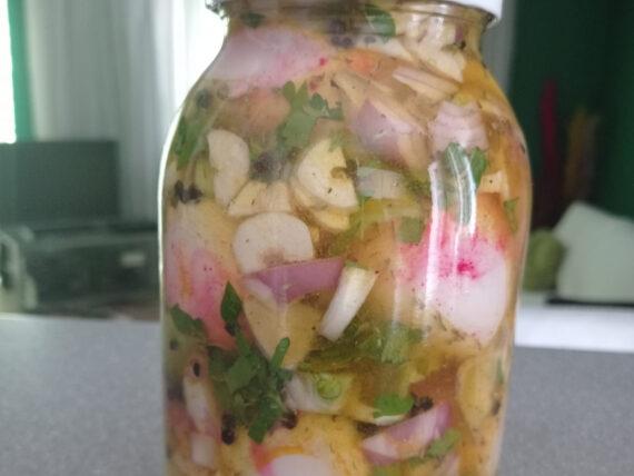 Είναι ένας υπέροχος μεζές για τσίπουρο, ρετσίνα, κρασί ή μπορείτε να τα κόψετε μετά σε ότι σχήματα θέλετε και να τα βάλετε σε σαλάτα…το ξύδι τα σφίγγει και έτσι διατηρείται το σχήμα που θα τους δώσετε. Το βάζετε στο ψυγείο για 10 μέρες κουνώντας το μια φορά την ημέρα και μετά από 10 μέρες είναι έτοιμα να τα χτυπήσετε αλύπητα.