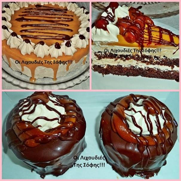 -Σε πιατέλα βάζω 1 τσέρκι και τοποθετώ 1 δίσκο παντεσπάνι.Σιροπιάζω με πινέλο και αδειάζω λίγη κρέμα. Ξανά παντεσπάνι,σιρόπι και κρέμα. Βάζω την τούρτα στην κατάψυξη να παγωσει 2 ωρίτσες. Την ξεφορμάρω και την περιχύνω με τη σάλτσα καραμέλας. Αυτη που θα περισέψει την ανακατεύω με λίγο σιρόπι σοκολάτας,ή λιωμένη κουβερτούρα,ή Μερέντα.Επίσης θα περισέψει λίγη κρέμα ή κρατήστε λίγη για τη διακόσμηση. -Βάζω σε σακουλιτσα την σοκολατένια σάλτσα καραμέλας και διακοσμω όπως θέλω από πάνω.