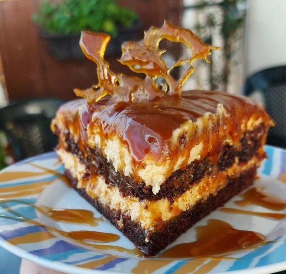 Είναι μία πεντανόστιμη τούρτα καραμέλα με σοκολατένιο παντεσπάνι και πολύ εύκολες παρασκευές. Αφράτο σιροπιαστό παντεσπάνι, βελούδινη κρέμα καραμέλας και ένα λαχταριστό γλάσο καραμέλας που έρχεται να απογειώσει την γεύση. Σίγουρα η συνταγή απευθύνεται στους λάτρεις της ζαχαροπλαστικής αλλά και της καραμέλας.