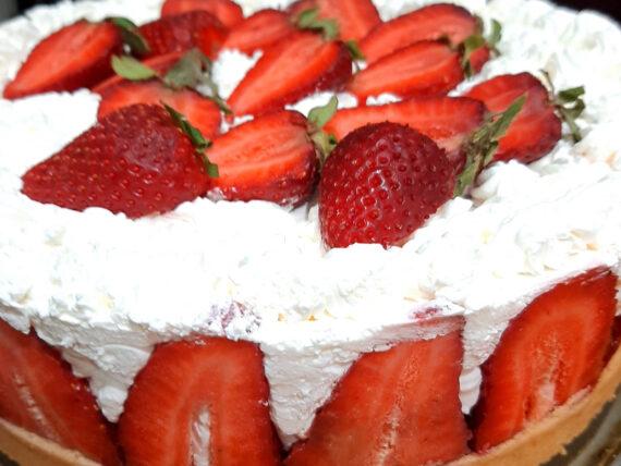 Μία δροσερή, ελαφριά λευκή τούρτα με σαντιγί, γιαούρτι και φρέσκες φράουλες που δεν σε λιγώνει και είναι ό,τι πρέπει για γιορτές, γενέθλια, δώρο σε έναν αγαπημένο μας άνθρωπο αλλά και σαν γλυκό στο Κυριακάτικο τραπέζι και στις ψησιματικές του σπιτιού μας. Δοκιμάστε την!