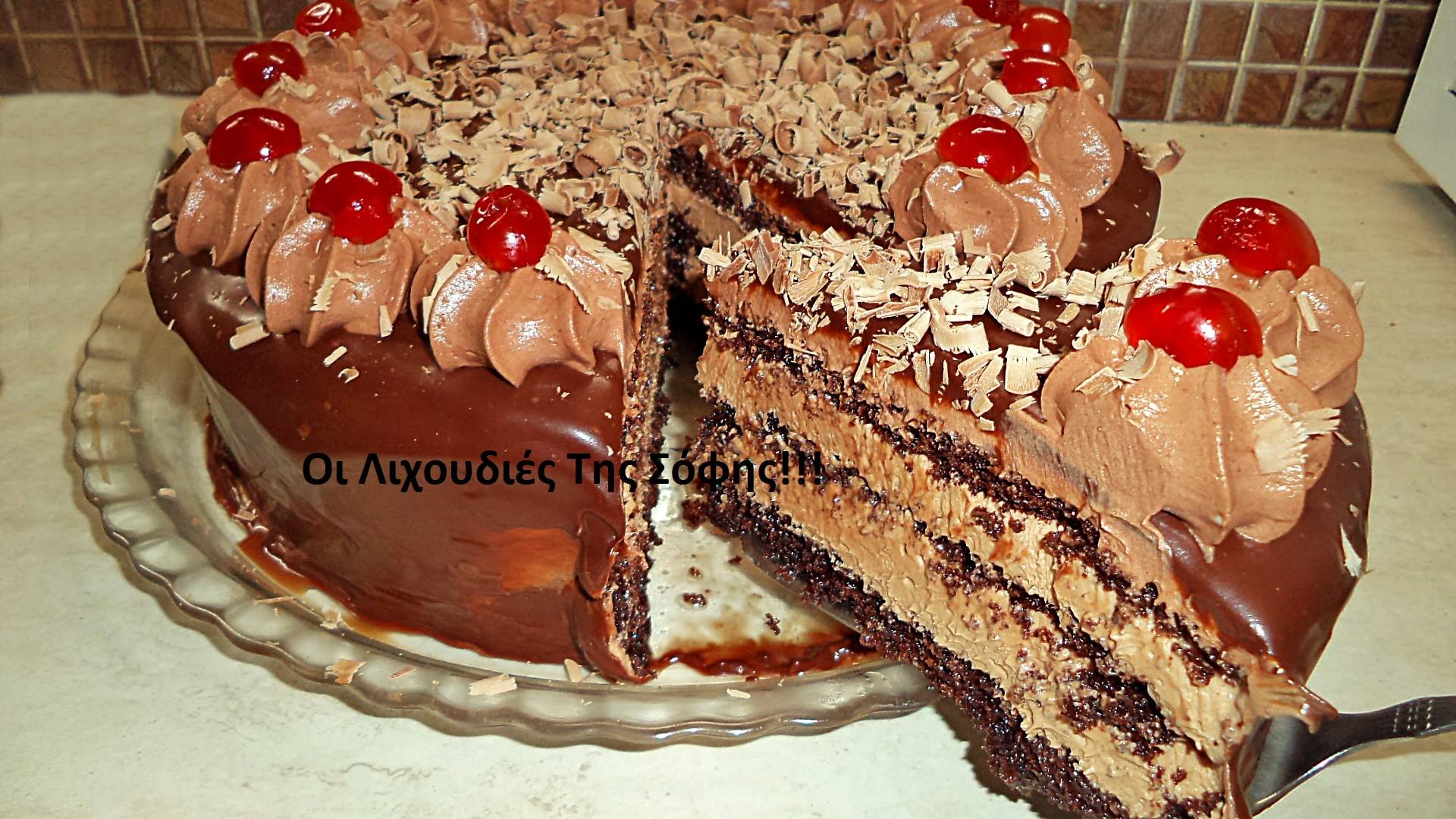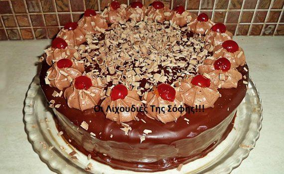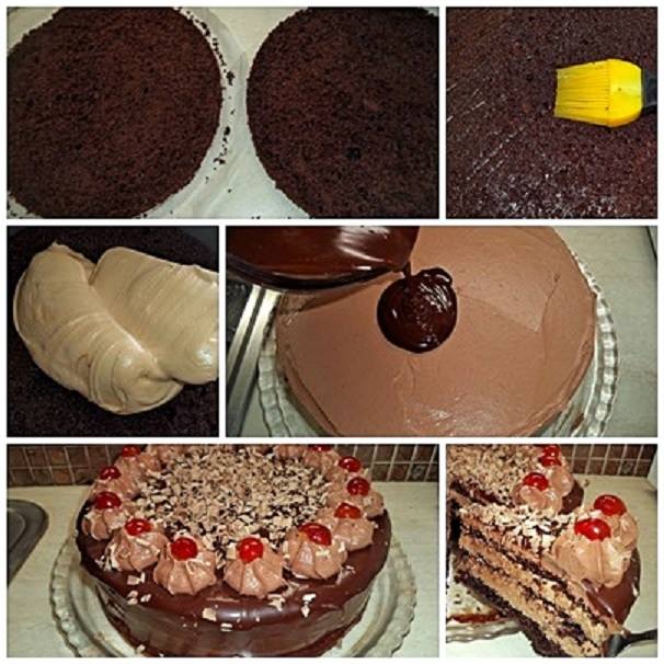 -Σε μια πιατέλα βάζω ενα τσέρκι 26-28 εκ. Τοποθετώ 1 δίσκο παντεσπάνι και Σιροπιάζω με πινέλο. Χωρίζω την κρέμα στα 3 και ρίχνω το 1/3 της κρέμας. Ξανά παντεσπάνι,σιρόπι και άλλο 1/3 της κρέμας. βάζω και τον 3 δίσκο παντεσπάνι,και βάζω το γλυκό κατάψυξη να μισοπαγώσει 1-2 ωρίτσες. Αφαιρώ το τσέρκι και καλυπτω με το τελευταιο 1/3 της κρέμας που έμεινε,πάνω και στα πλαινα της τουρτας. Την βάζω πάλι κατάψυξη 30 λεπτά. Περιχύνω με τη γκαναζ και καλυπτω και τα πλαινα της τούρτας. Για να κάνω τις ροζέτες σαντιγις χτυπησα 1 φακελάκι γκαρνι σκονη σοκολατα με 200 ml γάλα κρυο.και πασπαλισα με φλουδες σοκολατας,μπήγοντας και κερασακια γυρω γυρω!!! Είναι απίστευτα αφράτη και πεντανόστιμη!!!