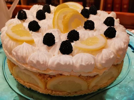 Κάνουμε μια στρώση το σορμπέ λεμόνι. Κάνουμε μια στρώση το υπόλοιπο μπισκότο. Από πάνω τοποθετούμε το παγωτό βανίλια. Τέλος διακοσμούμε με την σαντιγί και τοποθετούμε το παγωτό στην κατάψυξη. Διακοσμούμε την τούρτα μας με βατόμουρα ή ό,τι άλλο θέλουμε.