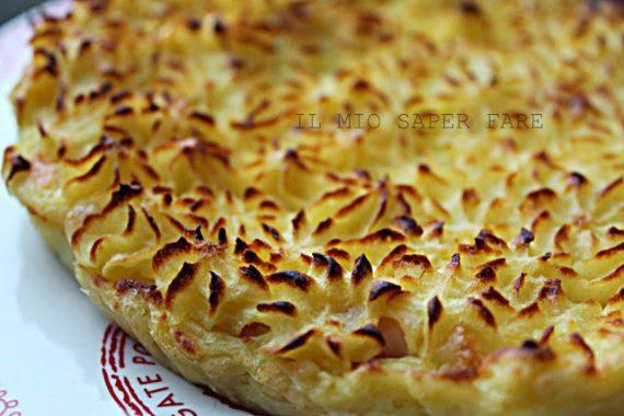 3.Τοποθευείστε σε ένα ταψί λαδόκολλα, πασπαλίζουμε με τριμμένη φρυγανιά και τοποθετήστε ένα στρώμα πουρέ περίπου το μισό. Καλύψτε με ζαμπόν, κομμάτια μοτσαρέλα και φέτες τυρί σε φέτες. Τοποθετήστε σε μια σακούλα ζαχαροπλαστικής τον υπόλοιπο πουρέ και με το ακροφύσιο αστέρι καλύψτε όλη την επιφάνεια της τούρτας. Ψήνουμε σε προθερμασμένο φούρνο στους 180 ° C για περίπου 20 λεπτά, τα τελευταία 5/7 λεπτά τοποθετήστε ταψάκι κάτω από το γκριλ για να ροδίσει ο πουρές. Σερβίρετε ζεστό, κομμένο σε φέτες.
