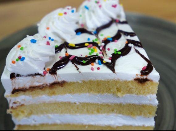 3 slices of sponge cake 400 ml whipping cream, chilled 2 tbsp. powdered sugar 1 vanillin sprinkles