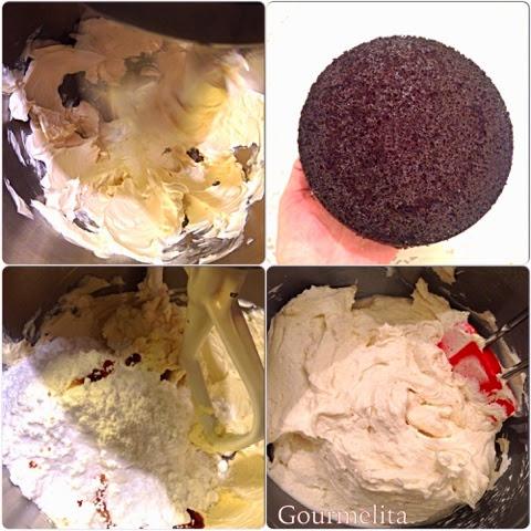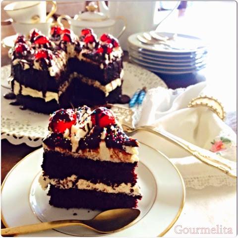 Προθερμάνετε τον φούρνο σας στους 175 βαθμούς Κελσίου. Ετοιμάστε δύο στρογγυλά ταψάκια των 15 περίπου εκατοστών, λαδώνοντας τα. Στο μπολ του μίξερ, ενώστε το αλεύρι, το κακάο, την ζάχαρη, την σόδα και το αλάτι. και ανακατέψτε τα. Προσθέστε το ξύδι, το λάδι, την βανίλια και το νερό, και ανακατέψτε με το μίξερ μέχρι να ενωθούν καλά τα υλικά. Ναι, σωστά διαβάσατε-όλα τα υλικά μαζί σε ένα μπολ, και το μίξερ ακόμα προαιρετικό είναι! Τοποθετήστε την ζύμη στις φόρμες, προσέχοντας να είναι ίση η ποσότητα, ώστε να ψηθούν στον ίδιο χρόνο. Ψήνετε για 25-30 λεπτά ακριβώς. Είναι έτοιμα όταν οδοντογλυφίδα που θα βυθίσετε στο κέντρο του κέικ, βγει καθαρή. Αφήστε τα να κρυώσουν μέσα στα ταψάκια. Φτιάξτε την γκανάς τοποθετόντας σε κατσαρολάκι το γάλα σόγιας. Φέρτε το σε βράση κι αμέσως σβήστε την φωτιά. Ρίξτε μέσα την σοκολάτα σπασμένη σε κομματάκια, και το μέλι, κι ανακατέψτε. Θέλουμε να γίνει ένα ομοιόμορφο, γυαλιστερό μείγμα, χωρίς σβόλους. Αφήστε την να πάρει θερμοκρασία δωματίου. Φτιάξτε το γλάσο, τοποθετώντας την μαργαρίνη στο μίξερ. Χτυπήστε την για 1 περίπου λεπτό, και προσθέστε το γάλα σόγιας, την άχνη και την βανίλια. Χτυπήστε μέχρι να αφρατέψει, αλλά και να ‘στέκεται’. Εάν σας φανεί πολύ σκληρό, προσθέστε 1 κσ γάλα, και αντίστροφα-πολύ υγρό-προσθέστε ζάχαρη. Όταν τα κείκ σας είναι εντελώς κρύα, αφαιρέστε τα από τα ταψάκια, και τοποθετήστε το ένα πάνω σε πιατέλα. Απλώστε πάνω του ένα παχύ στρώμα από το γλάσο, και τοποθετήστε το δεύτερο κέικ από πάνω. Καλύψτε το κι αυτό με γλάσο. Τοποθετήστε εάν θέλετε γλάσο σε ένα κορνέ, και φτιάξτε μερικές ροζέτες. Κόψτε τα κεράσια γλασέ στα δύο, τοποθετήστε τα πάνω στην τούρτα, και περιχύστε με την γκανάς. Τελειώνετε ρίχνοντας λίγη τρόυφα ή πολύχρωμα sprinkles!