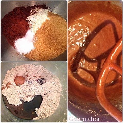 1.5 κούπα αλεύρι 3 κσ κακάο 1 κούπα ζάχαρη καστανή 1.5 κγ σόδα μαγειρικής 1/2 κγ αλάτι 1 κγ λευκό ξύδι 1 βανίλια ή 1 κγ υγρή βανίλια 5 κσ ελαιόλαδο 1 κούπα νερό