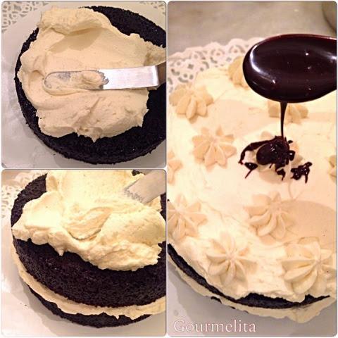 Σε ένα κατσαρολάκι λιώνουμε το βούτυρο κακάο σε πολύ χαμηλή θερμοκρασία. Αποσύρουμε το κατσαρολάκι από τη φωτιά και προσθέτουμε όλα τα υπόλοιπα υλικά. Ανακατεύουμε καλά. Προσοχή δεν ξαναβάζουμε το κατσαρολάκι στη φωτιά γιατί θα “κόψει” το μίγμα. Περιχύνουμε την τούρτα με την ganache όσο είναι ζεστή γιατί πήζει σύντομα.