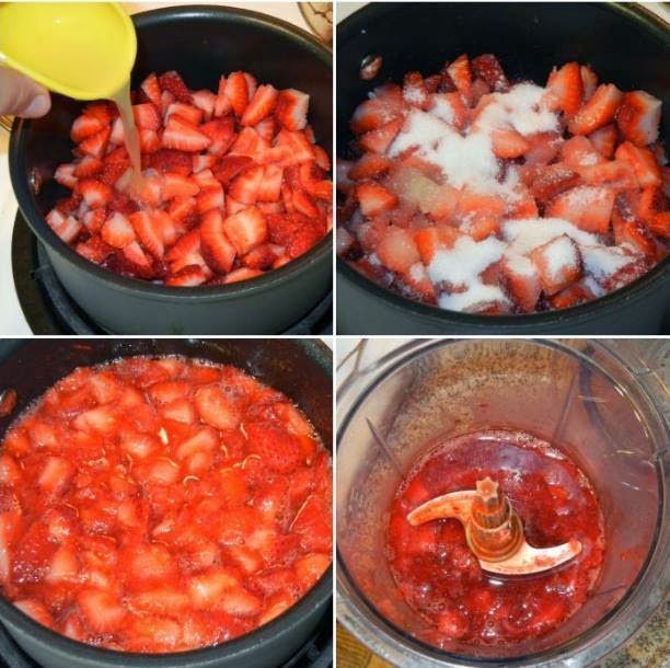 Αν είναι κατεψυγμένες οι φράουλες τις αφήνεις σε σιγανή φωτιά να ξεπαγώσουν λίγο για να λιώσουν πιο εύκολα. Τις χτυπάς στο μπλέντερ ή αν έχεις ράβδο μέσα στη κατσαρόλα να πολτοποιηθουν και προσθέτεις τη ζάχαρη.