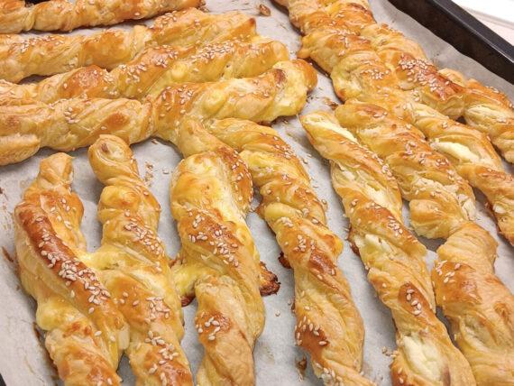 Τα στρίβουμε, τα τοποθετούμε σε ένα ταψί με λαδόκολλα και τα αλείφουμε με αυγό. Πασπαλίζουμε με σουσάμι και ψήνουμε στους 180 βαθμούς Κελσίου, στις αντιστάσεις, πάνω κάτω.