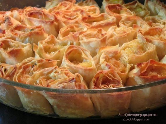 Ανακατεύουμε βούτυρο, λάδι, σόδα και αυγό. αν το φύλλο είναι φρέσκο βάζουμε λιγότερη σόδα… Απλώνουμε ένα φύλλο κάθε φορά και με το πινέλο βρέχουμε το φύλλο. Διπλώνουμε το φύλλο και βάζουμε τη γέμιση, κάνουμε ρολό, κάνουμε το ίδιο με όλα τα φύλλα. Κόβουμε τα ρολά περίπου στους 3 πόντους και αραδιάζουμε όρθια σε βουτυρωμένο ταψί τα κομμάτια.