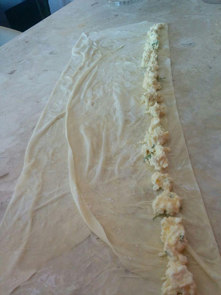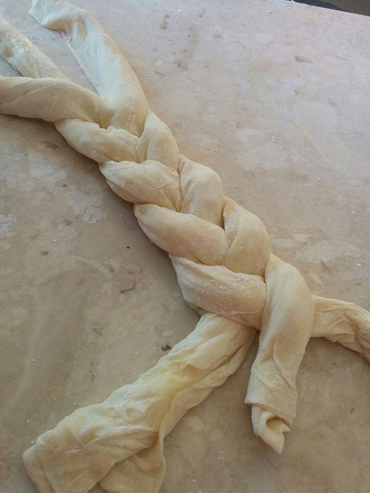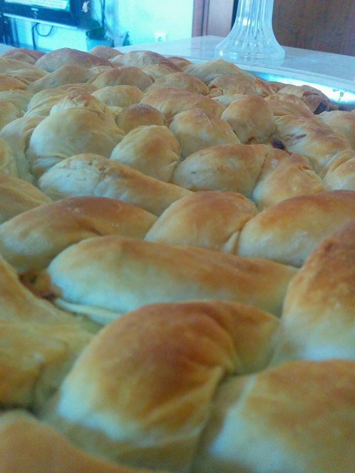 Αφού ζυμώσω το ζυμαράκι μου, κόβω μπαλάκια των 80 γρ, και τα ανοίγω φύλλο, ραντίζω με λάδι, και διπλώνω. Απλώνω τη γέμιση κ τυλίγω. Κάνω πλεξούδες κ τις μεταφέρω στο ταψί. Ψήνω στον αέρα στους 190 μέχρι να ροδίσει.