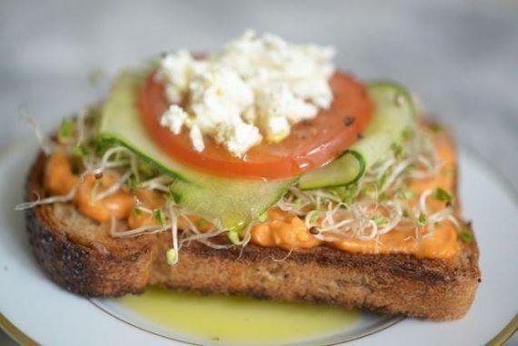 2. Μεσογειακό τοστ: Πάνω σε μια ψημένη φέτα ψωμιού απλώνετε χούμους με ντομάτα και σκόρδο. Αν σας είναι δύσκολο, απλώς βάλτε λίγη σάλτσα ντομάτας. Από πάνω τοποθετήστε λεπτές φέτες αγγουριού, ντομάτα, τριμμένη φέτα και λάδι. Έτοιμο!