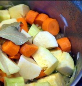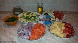 Καθαρίζουμε και πλένουμε όλα τα λαχανικά και τα κόβουμε σε ροδέλες. Έπειτα, πολτοποιούμε το σκόρδο.