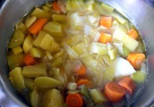 2 πατάτες 2 καρότα 2-3 σέσουλα (ή λαχανίδες) 1 πράσο ψιλοκομμένο 2 κρεμμυδάκια 1 ντομάτα ώριμη 2 κουτ. σούπας κορν φλάουρ Λίγο σέλινο 1-2 ματσάκι μαϊντανό αλάτι, πιπέρι 4-5 κουταλ. σούπας ελαιόλαδο (προαιρετικά)
