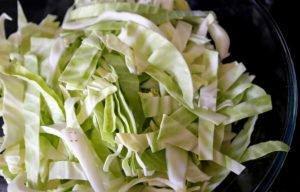 Καθαρίζω το λάχανο και το κόβω σε χοντρά κομμάτια. Σοτάρω τα κρεμμύδια σε λίγο ελαιόλαδο και έπειτα ρίχνω και το λάχανο με το υπόλοιπο λάδι.